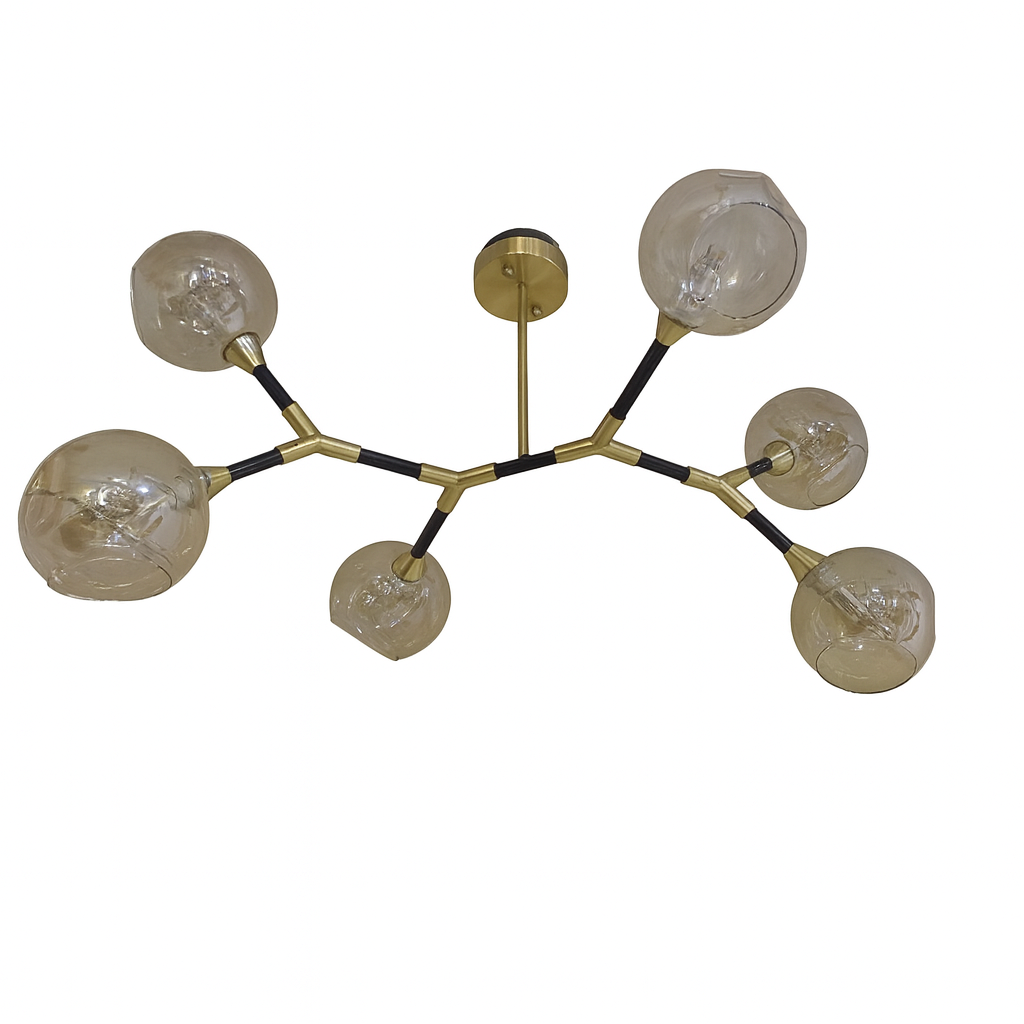 CORP DE ILUMINAT PE FIR BARTON NEGRU + AURIU - 6 GLOBURI STICLA TRANSPARENTA