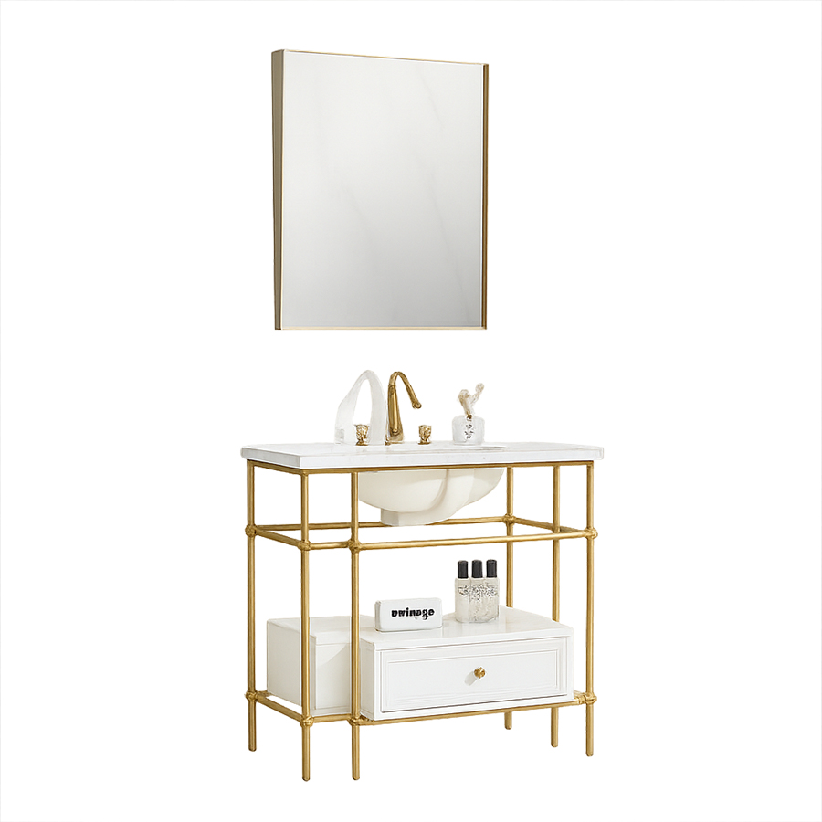 Detalii suplimentare:Blat - placaj marmura Corp mobilier - placaj de lemn tip Tego rezistent la apa Lavoar - ceramica, alb Oglinda - sticla + margine metal aurie Dimensiuni oglinda - Diametru 109.2 cm Setul nu include robinet, sifon si ventil