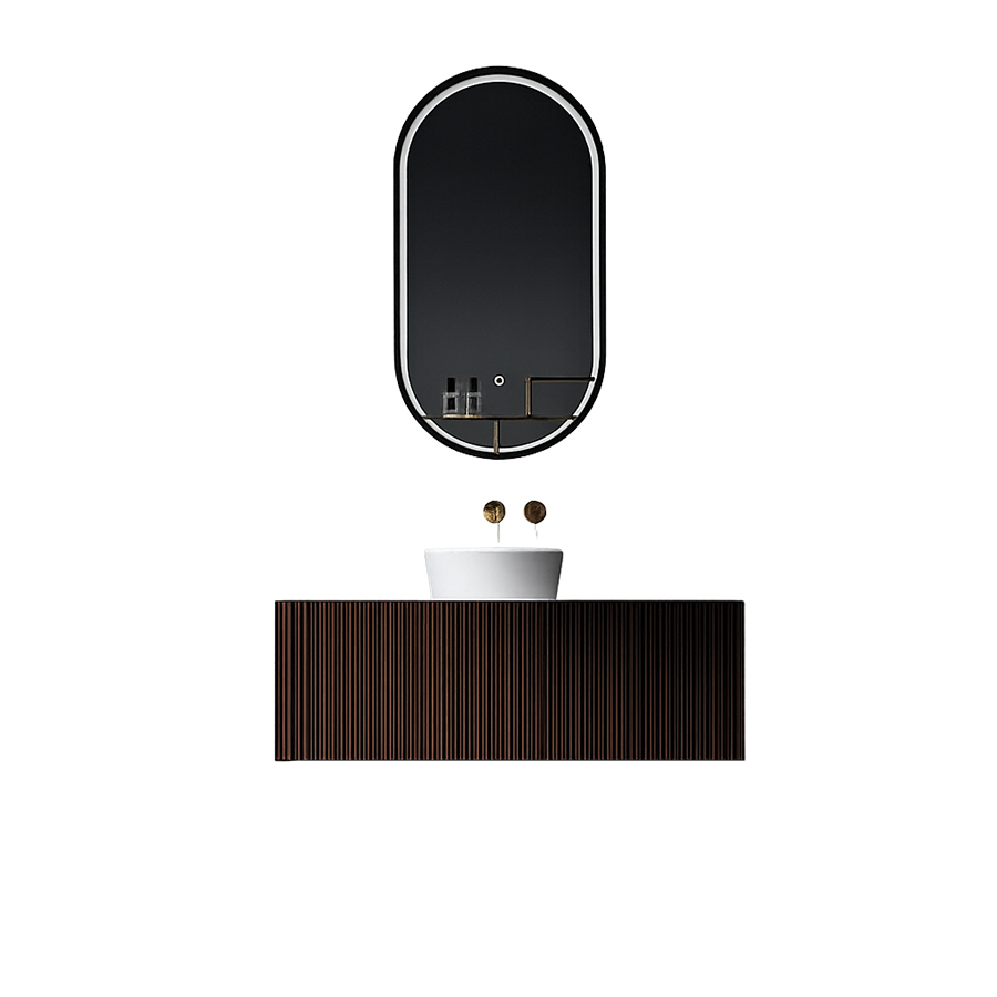 Blat - placaj de lemn tip Tego rezistent la apa, maro Corp mobilier -placaj de lemn tip Tego rezistent la apa, maro Oglinda - sticla + banda LED Setul nu include robinet, sifon si ventil