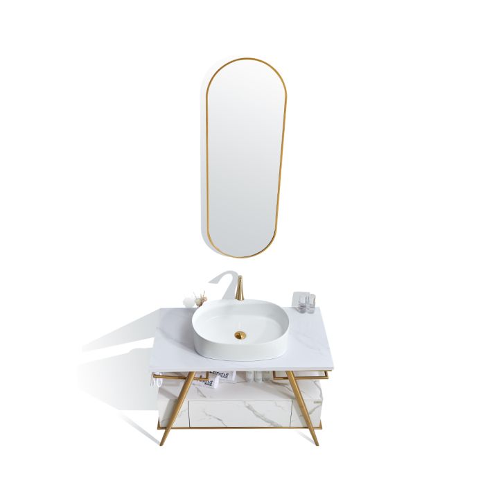 Blat - placaj compozit alb Corp mobilier - placaj de lemn tip Tego rezistent la apa Oglinda - sticla + margine metal aurie Dimensiuni oglinzi - Latime 40 cm, Inaltime 115 cm Setul nu include robinet, sifon si ventil