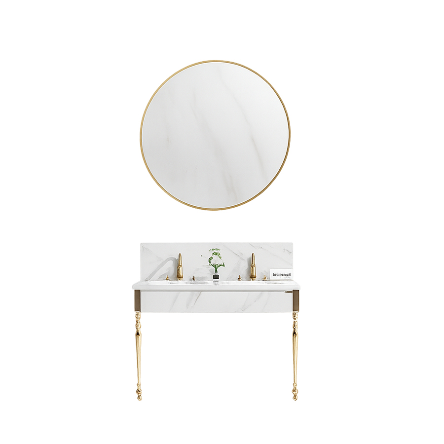 Blat - placaj marmura Corp mobilier - placaj marmura rezistent la apa Lavoar - ceramica, alb Oglinda - sticla + margine metal aurie Dimensiuni oglinda - Diametru 109.2 cm Setul nu include robinet, sifon si ventil
